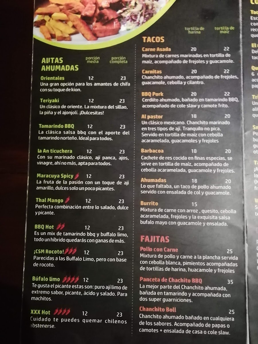 The Alitas Ahumadas BBQ Hot brings a bit of spice to the table, featuring wings that are both smoky and fiery, while the Alita BBQ Ahumadas offers a milder yet equally delicious BBQ flavor. Whether you're a fan of tacos, burritos, or wings, Smoky Wings delivers a diverse and satisfying menu that promises something for everyone.