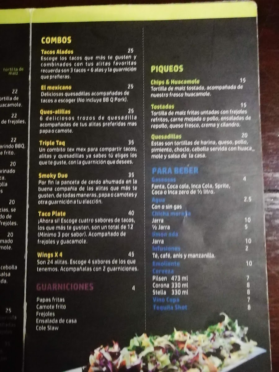 The menu at Smoky Wings offers a vibrant mix of flavors, perfect for anyone craving a delicious and satisfying meal. One standout item is the Burrito, a flavorful and hearty option for those seeking a filling dish. If you're in the mood for something cheesy, the Quesadillas are a great choice, offering a perfect blend of melted cheese and savory fillings. For fans of smoky and tangy flavors, the Alitas A la BBQ delivers perfectly grilled wings smothered in a delicious BBQ sauce.